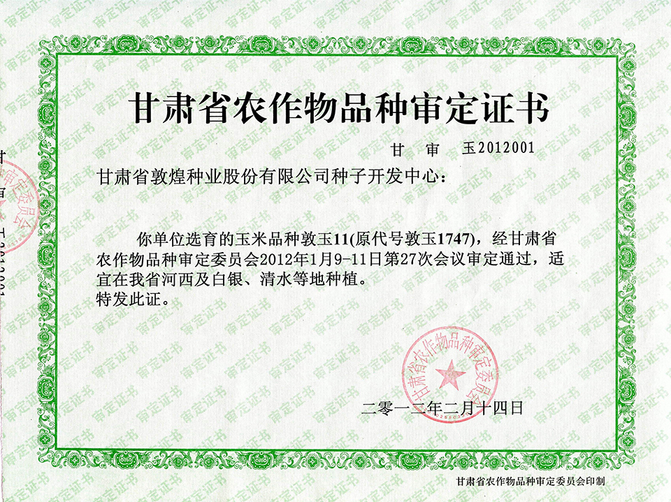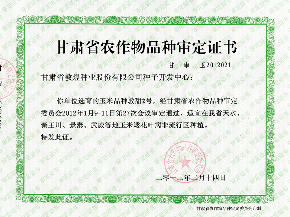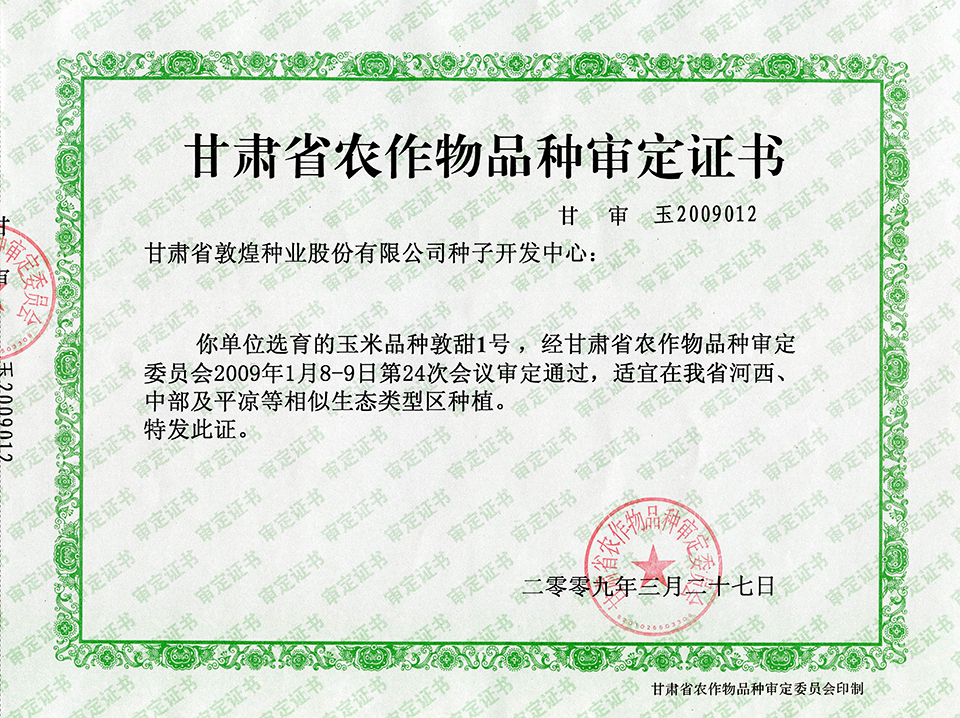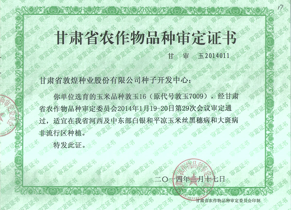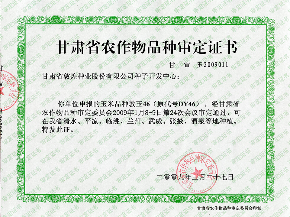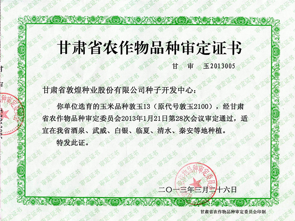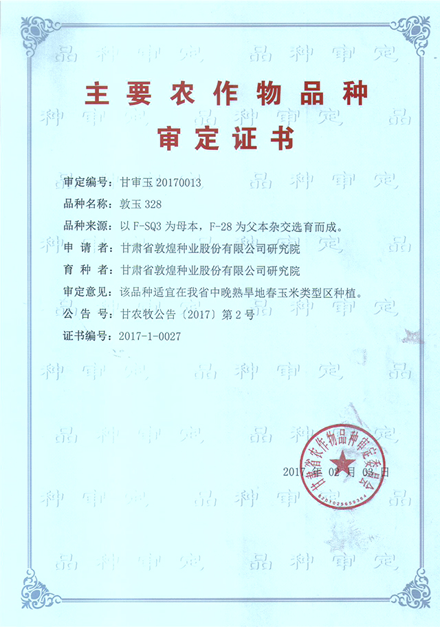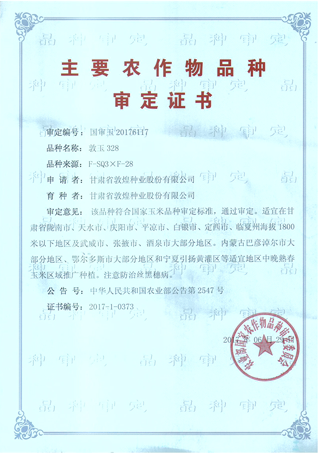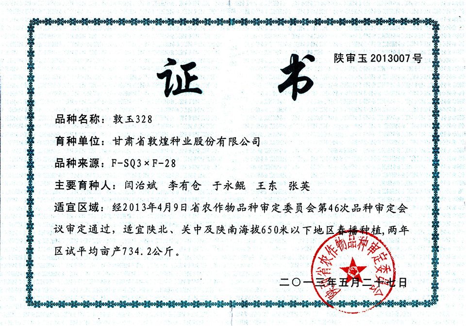 敦玉328品種審定證書(甘肅)